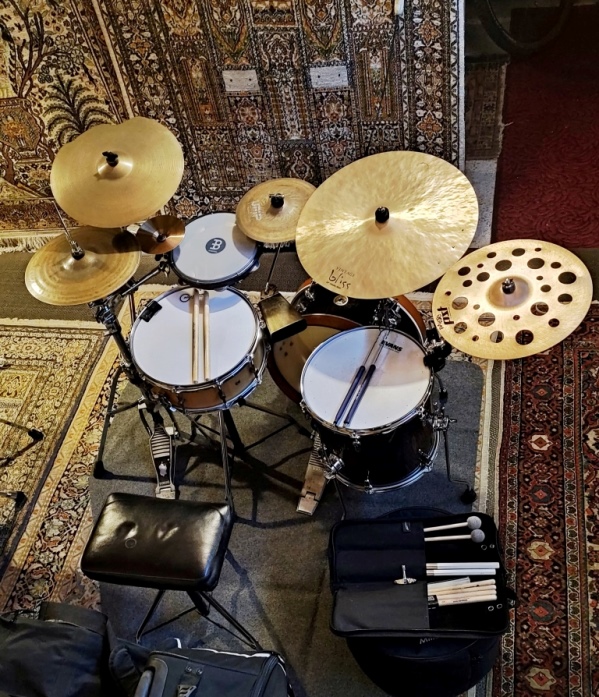 Accessories: Cowbells, double bass drum pedal, Djembč, timbalitos, hand percussions, Cahňn, Meinl Bass Box, rain sticks, lots of sticks, mallets, brushes, rods, ecc